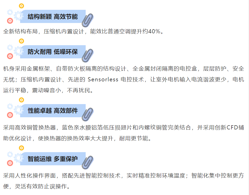 該機組通過國家級CNAS實驗平臺嚴格測試驗證,全年能效比(AEER)≥4.0,達到一級能效,并獲得CCC、CQC等認證。適用于中小型機房、設備機房高端通信基站各類設備間、電池間、電力間、變電站、配電室、監控室等。