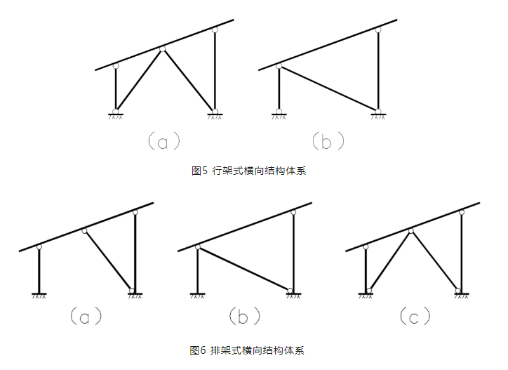 圖4所示支架橫向結構可根據立柱與基礎連接形式的不同,分為兩種結構體系,柱底鉸接和柱底固結的形式。柱底鉸接形式為行架式橫向結構體系,柱底固結為排架式橫向結構體系。圖5所示兩種形式均為行架式橫向結構體系,該結構體系前后立柱與基礎采用鉸接的形式,并且采用一根或者兩根橫向支撐提供側向剛度,形成穩定的結構不變體系。圖6所示三種形式均為排架式橫向結構體系,該結構體系前后立柱與基礎采用固結的形式,并且采用一根或兩根縱向支撐提供側向剛度,增強結構的抗側力穩定性。基礎設計同傳統光伏支架。