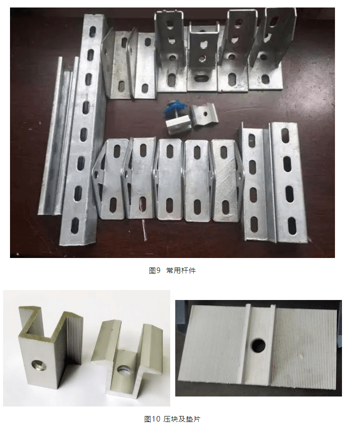 圖10為光伏常用壓塊和墊片,壓塊與墊片采用螺栓擰緊,中間夾光伏組件實現固定。