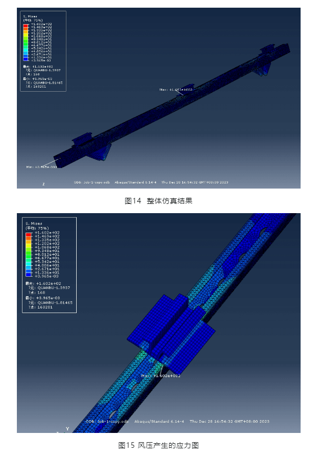 設計規范要求,支架采用的螺栓均固定擰緊。因此,各部分可視為緊密結合,不產生滑移,采用共單元節點進行仿真分析。通過圖14及圖15可以看出,風壓產生的最大應力在橫梁上,為160.2MPA,小于鋼材強度設計值215MPA。