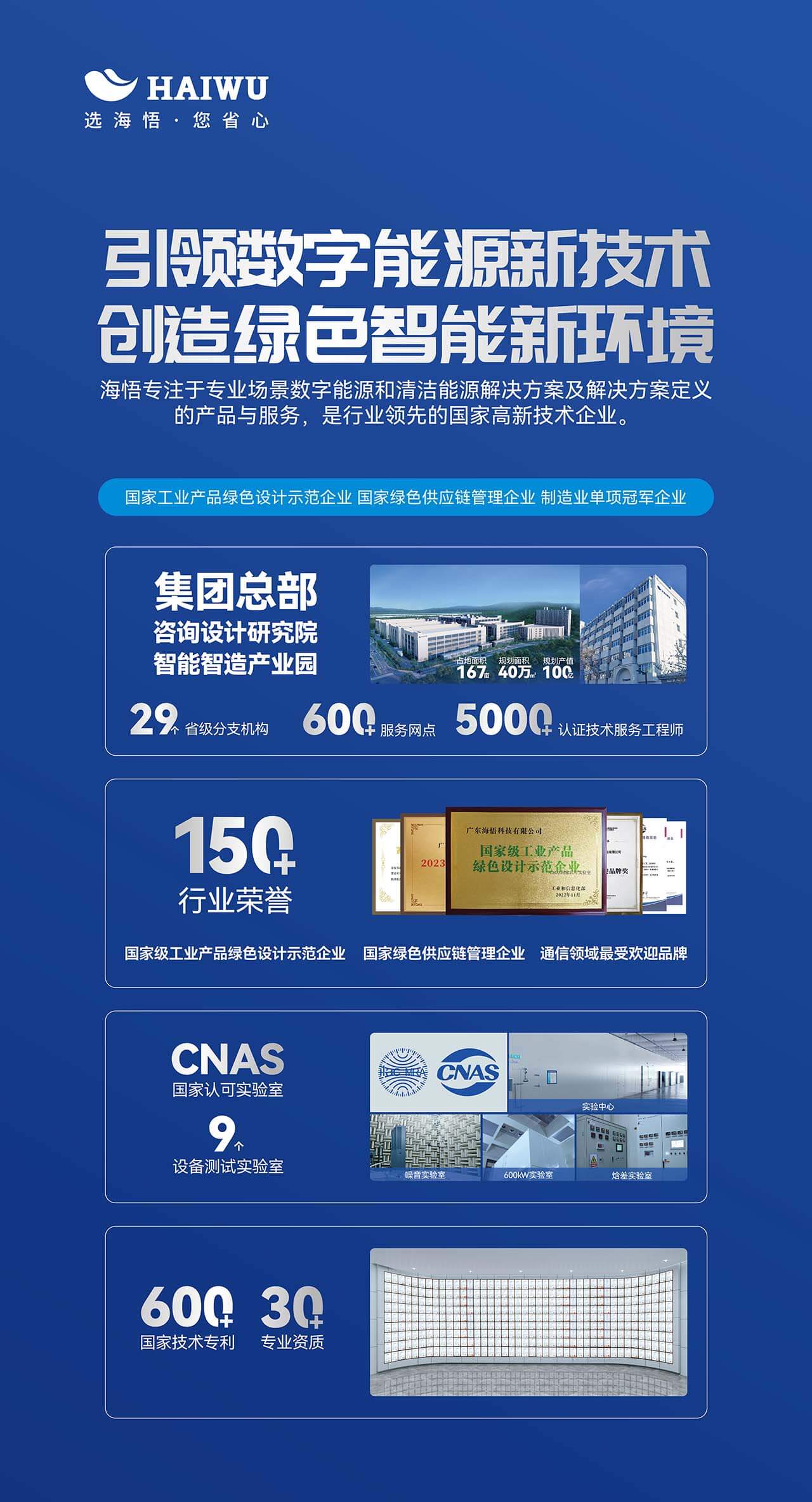 作為行業的領軍品牌,海悟深耕咨詢、設計、聯合開發、機電總包、測試認證、綜合代維、優化升級全價值鏈垂直整合。擁有產值規模達百億的大型智能制造產業群,具備國際化一流的生產智造實力。300+專業研發技術人員,600+國家技術專利,具備建筑工程設計甲級資質的咨詢設計研究院在行業獨樹一幟,每一項數據都彰顯著海悟強大的定制開發能力和創新研發實力。憑借29年的堅實邁步,海悟已獲國家級工業產品綠色設計示范企業、國家綠色供應鏈管理企業、制造業單項冠軍企業等150+行業榮譽,綜合實力獲得多方認可。
