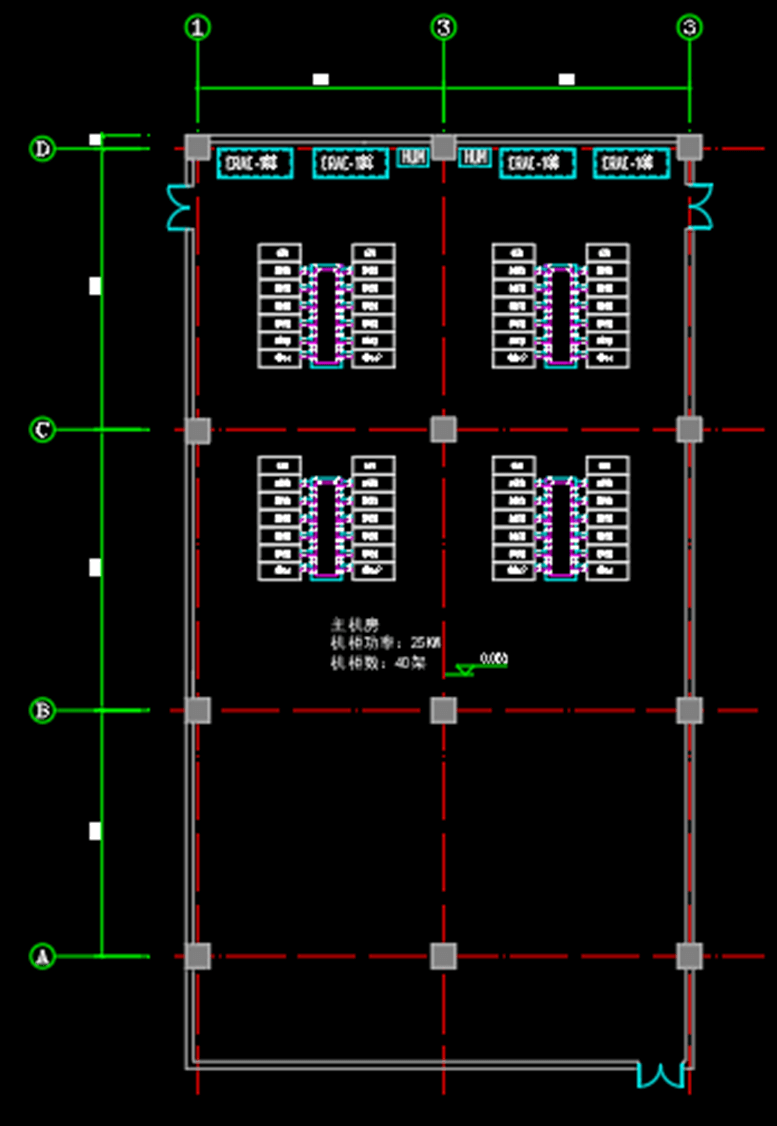 根據設計方案部署4個相同的雙排微模塊,并在每個機柜處增加2根分集水器manifold(支路數根據服務器數量確定),機柜底部開孔,并在安裝manifold的一邊側板上增加固定件及孔位,機房設置靜電地板,凈空高度建議不少于600mm。該方案布置方案如下圖: