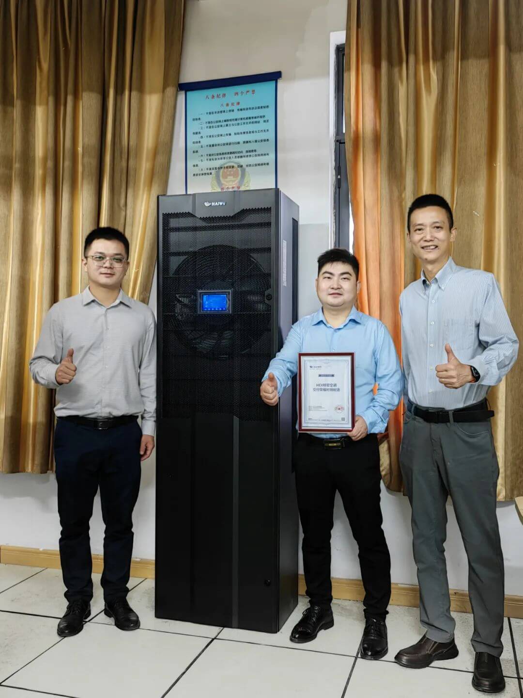 HEX精密空調(diào)已在全國范圍批量交付,海悟合作伙伴業(yè)務(wù)及分銷渠道總監(jiān)戴勇赴長沙客戶現(xiàn)場,與海悟湖南代表處一起為分銷合作伙伴湖南銀博信息科技發(fā)展有限公司頒發(fā)了“HEX精密空調(diào)交付榮耀時刻紀(jì)念”證書。