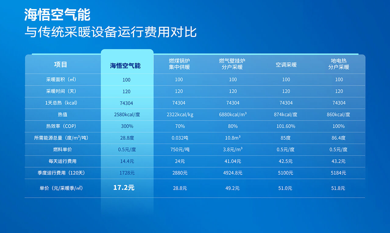 相比傳統采暖方式,海悟空氣能熱泵在費用上具有明顯優勢。以一個采暖季(120天)為例,100平方米的采暖面積使用海悟空氣能熱泵的運行費用僅為1728元,單價僅為17.2元/采暖季/㎡,遠低于其他采暖方式。此外,海悟空氣能熱泵采用清潔能源,無廢氣排放,符合環保要求,讓您在享受溫暖生活的同時也為地球環保做出貢獻。