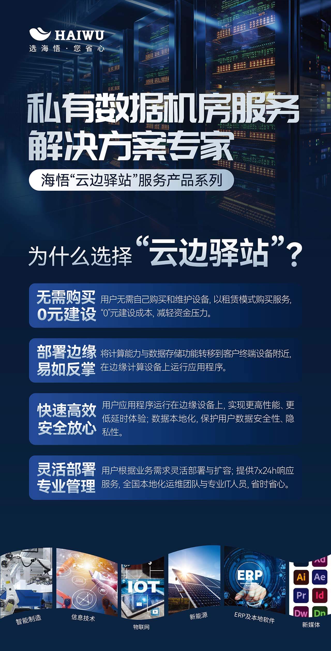 在數(shù)字化轉型的浪潮中,企業(yè)數(shù)據(jù)的安全與高效處理成為了核心競爭力的重要組成部分。面對日益增長的數(shù)據(jù)存儲需求與復雜的IT管理挑戰(zhàn),海悟云匠心打造“云邊驛站”私有數(shù)據(jù)中心托管服務解決方案,旨在為企業(yè)提供一站式的本地化算力與數(shù)據(jù)安全存儲方案,讓企業(yè)在享受云端便捷的同時,牢牢把握數(shù)據(jù)主權,專注核心業(yè)務的發(fā)展。