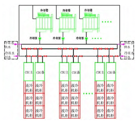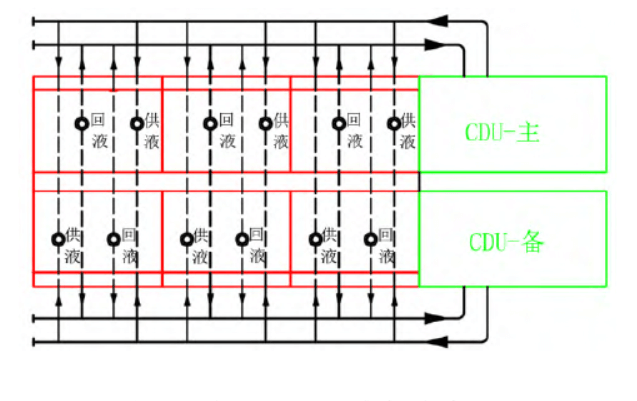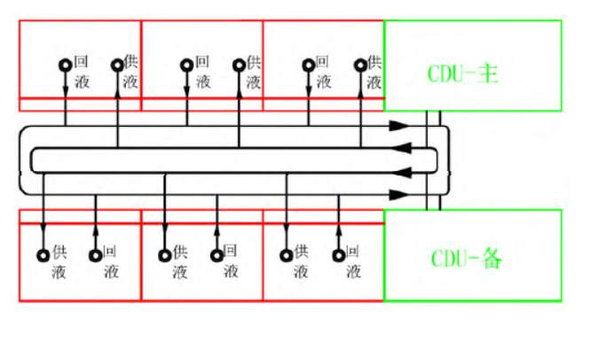 3)將CDU集中布置到一個(gè)區(qū)域或者集中到幾個(gè)有序區(qū)域,使液冷設(shè)備管路和冷卻水管路有明確的物理分區(qū),一方面可以使各功能區(qū)有序布局,另一方面能夠更加簡(jiǎn)潔的實(shí)現(xiàn)冷卻水管路和閥門冗余設(shè)計(jì)。