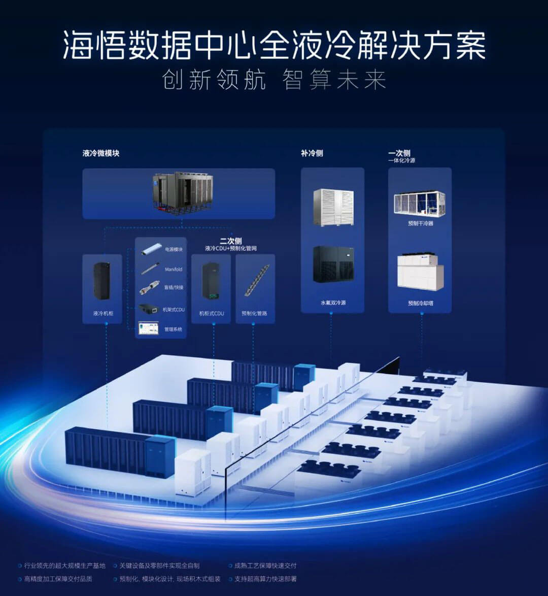 海悟數據中心全液冷解決方案充分考慮設計方案、運行模式、交付流程、運維管理等全生命周期的各環節要素,具有“全景應用、全域適配、全速交付、全程可靠”四大核心優勢。