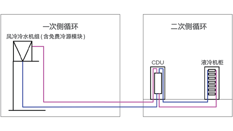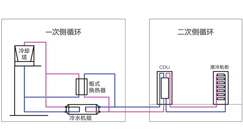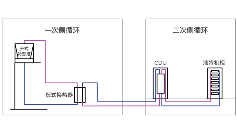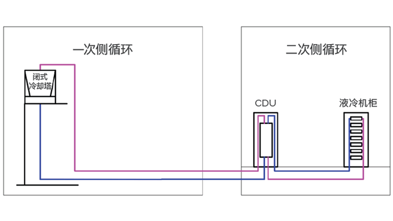 二次側液體回路是指從冷量分配單元到機架,通過供回冷卻工質歧管和 IT 設備連接,然后再通過歧管返回冷量分配單元的設計。來自二次側冷卻回路的熱量通過冷量分配單元的板式熱交換器傳遞到一次側冷卻回路, 最終排放到大氣中或被熱回收再利用。6. 二次側冷板液冷概述
