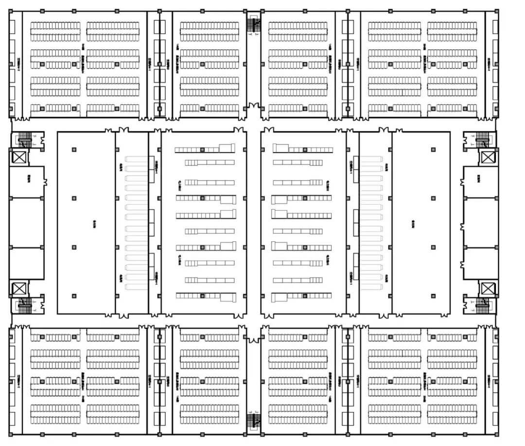 數據中心建筑內包括數據機房、電力室、電池室、空調設備用房、柴油發電機房等組成部分,設計時充分考慮電力、空調制冷量、機柜數量和機柜總功率等因素,盡量做到電力資源利用最大化,同時降低PUE、WUE等指標。因此數據中心設計通常采用模塊化布局,按照變壓器和UPS容量推導機架總功耗、機架數量、空調設備配置, 從而形成一個標準的機房模塊,模塊之間進行組合形成一個機房單元,機房單元通過交通空間鏈接和配套用房輔助就形成了完整的建筑平面。