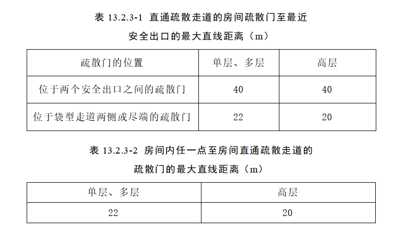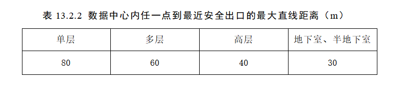 當數據中心按照廠房進行設計時,數據中心的火災危險性分類應為丙類,數據中心內任一點到最近安全出口的直線距離不應大于表13.2.2的規定。當主機房設有高靈敏度的吸氣式煙霧探測火災報警系統時,主機房內任一點到最近安全出口的直線距離可增加50%。