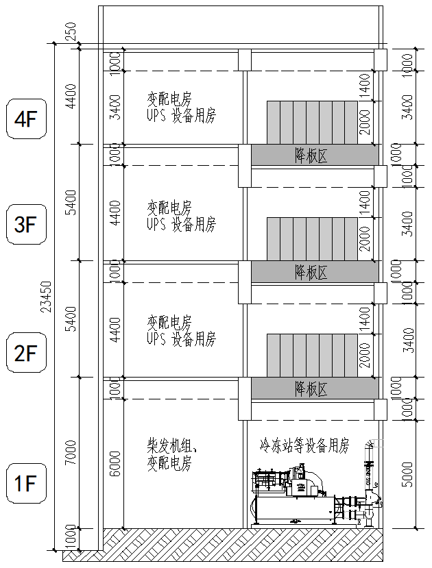 一層凈高:一層凈高以滿足變配電房和冷凍機房凈高需求為主,柴發機組設置在室內的亦考慮柴發機組凈高