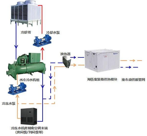 冷凍水型機房空調系統通常全年能源效率低,一般采用冷凍水側余熱回收,系統原理如下圖(圖1)。余熱回收利用主要發生在冬季,通過余熱回收機組進行熱回收,為周圍建筑物供暖。