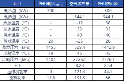 冬季采暖季節, PHU熱回收機組可維持更高的蒸發溫度,利用小壓比壓縮機,以極致的效率產出熱能,整機制熱能效比空氣源熱泵機組有顯著提升,從下面的對比表里可以一探端倪: