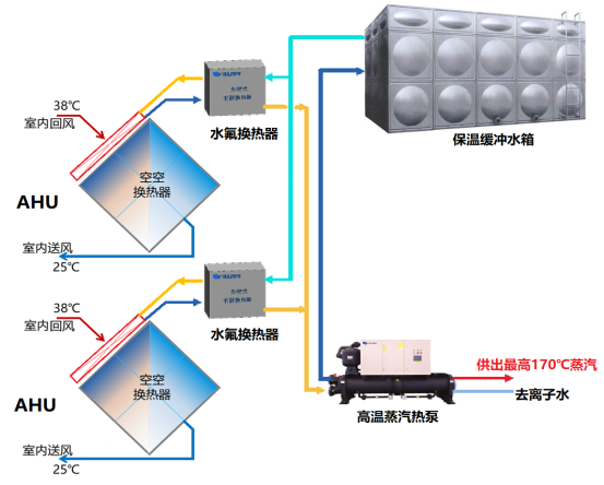 AHU空調系統是一種被大型數據中心機房廣泛采用的溫控方式,尤其在北方地區,能充分利用自然冷源,大幅降低全年運行PUE。其余熱回收原理見下圖(圖2),從機房出來的38℃熱風流過為余熱回收而增設的熱泵機組的蒸發器,溫度被降低到26~28℃,此處熱量品位較高,回收效果最佳。然后,再過AHU機組中的空-空換熱器與室外空氣換熱,此時AHU可根據室內回風溫度自動調節進入空空換熱器的室外冷風。
