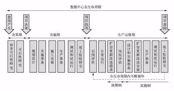 數據中心全生命周期,是指從建設意圖產生到數據中心經濟壽命結束的全過程。通常分為決策期、實施期和生產運維期,每一個時期又分為若干階段。具體如圖2-1所示。