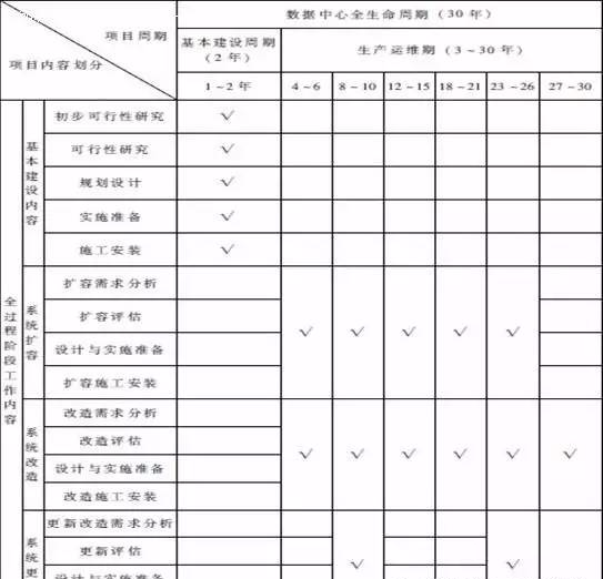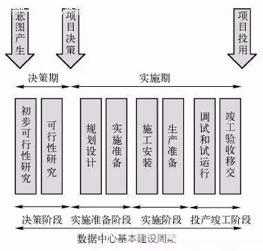 為了更好地區分各個建設階段,我們引入"數據中心基本建設周期"概念,是指:自項目開始至項目基本建設完成并達到預先規劃要求,數據中心可以提供正常運營使用為止的一個周期。這也就是建設項目決策期和實施期的內容,不包含后期數據中心生產運營期內的擴容、更新和改造等內容。