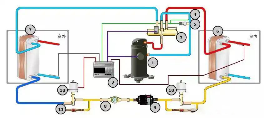 循環(huán)過程:供暖末端設備將熱量傳遞給室內(nèi)空氣,實現(xiàn)室內(nèi)取暖。而冷卻后的制冷劑,則通過膨脹閥回到蒸發(fā)器,再次踏上吸收熱量的旅程,形成了一個完美的閉環(huán)循環(huán)。
