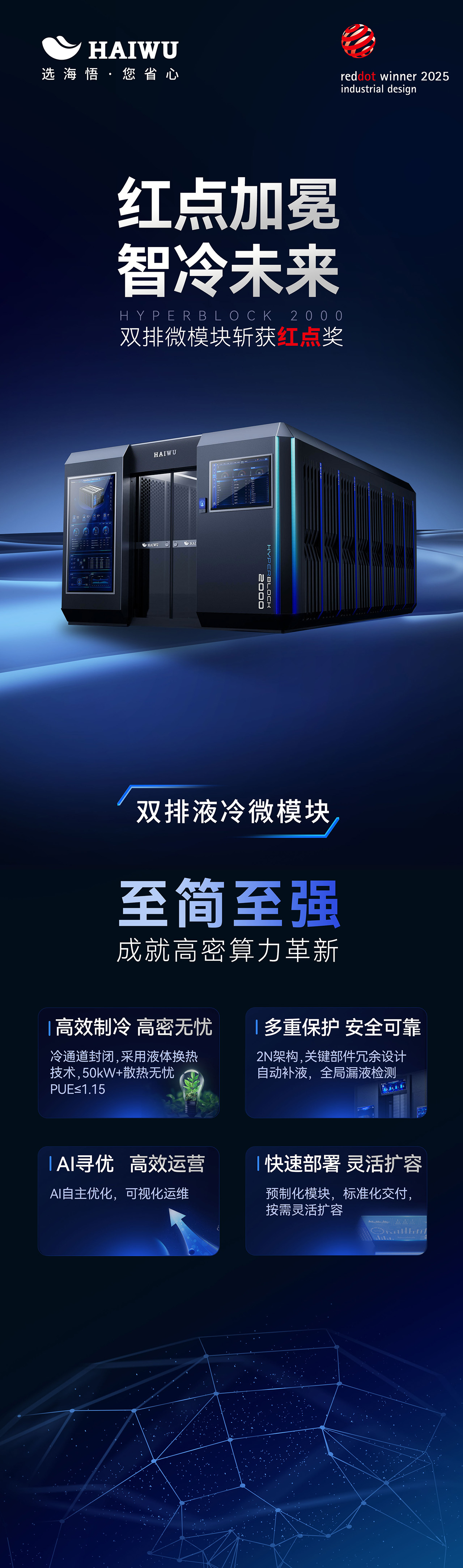 近日,素有工業設計領域"奧斯卡"之稱的德國紅點獎(Red Dot Award)2025年設計大獎獲獎名單正式揭曉。來自中國的海悟HYPERBLOCK 2000雙排微模塊憑借其創新的模塊化設計、高效能溫控技術及低碳環保理念,一舉斬獲2025年紅點獎工業設計大獎,成為全球數據中心行業關注的焦點。這一殊榮不僅是對海悟30余年技術研發實力的國際認可,更標志著中國企業在高端數據中心溫控領域邁出了關鍵一步。