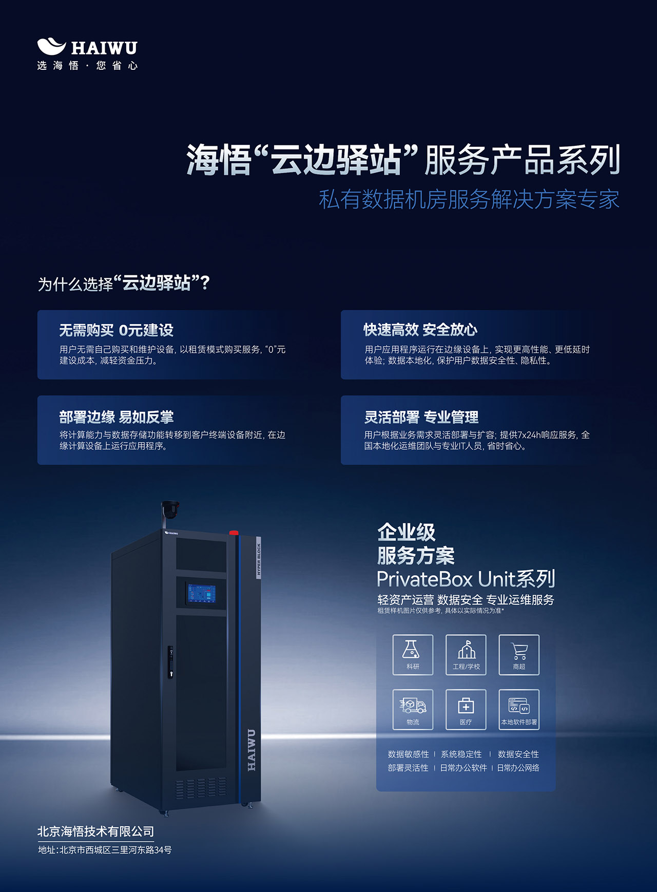 在智能算力需求激增、國家大力推動算力發展的當下,企業對高效、低成本、易運維的私有云服務需求日益迫切。海悟云 “云邊驛站” 憑借其在成本、運維、空間上的獨特優勢,成為傳統企業私有云的理想替代方案。選擇 “云邊驛站”,企業可以將更多精力集中在核心業務上,降低運營成本和管理風險,在數字化轉型的浪潮中搶占先機,實現高質量發展。